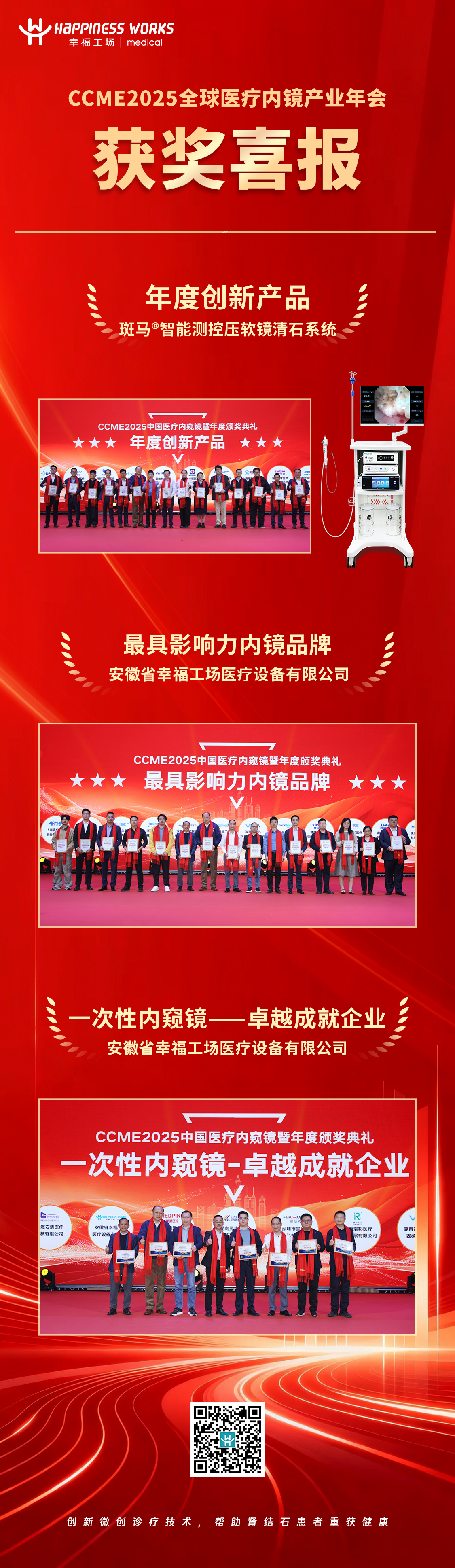 CCME 2025 2025年12月26日,在深圳举办的2025全球医用内窥镜行业年会上,幸福工场以卓越的产品实力与品牌影响力荣获——CCME2025"最具影响力内镜品牌"奖与"一次性内窥镜——卓越成就企业"奖,幸福工场自主研发的斑马®智能测控压软镜清石系统同步荣获"年度创新产品"奖。 关于幸福工场 About HappinessWorks 幸福工场医疗设备有限公司成立于 2017 年 6 月,是专注于泌尿结石微创领域的高新技术企业,集一次性电子内窥镜及相关配套设备研、产、销于一体。公司以“持续创新微创诊疗技术,帮助肾结石患者重获健康”为使命,创业之初,在郭应禄院士、吕福泰教授的指导下,通过引进美国硅谷专利技术,经消化、吸收、改进并创新,建成具有领先水平的一次性电子内窥镜系统化诊疗技术研发平台。公司先后荣获“高层次人才团队 A 类”、“创响中国一等奖”、“国家级专精特新小巨人企业”等多项荣誉。 2019 年,幸福工场成功注册斑马 ® 一次性电子输尿管软镜,并于 2020 年 1 月正式上市,成为该类产品中国首家上市的企业。2023 年 4 月,全国首款、全球第二款测压软镜——斑马®一次性使用术中测压输尿管内窥镜获批上市。2025 年3 月,斑马 ®测控压及灌注吸引系统正式推出。斑马®镜在成像清晰度、先端外径、镜体外径、转弯半径、转弯角度、同轴性及镜体重量六项指标上均达到国际领先水平,广受泌尿外科医生的认可与青睐。目前相关产品已在全国 2000 多家医院开展临床应用,其中包括 300 余家三级甲等医院。 此次斑马®智能测控压软镜清石系统荣获"年度创新产品"奖,标志着幸福工场在智能诊疗领域的重大突破。该系统通过实时压力监测、智能恒压控制及独创的"一键清石"功能,实现了泌尿外科手术安全性与效率的双重提升。 未来,幸福工场将继续秉承“从临床中来,回到临床中去”的初心,以及“以患者为中心、以奋斗者为本;诚信、专注、专业、创业”的核心价值观,聚焦更高效、更安全、更彻底、更智能的即刻清石理念,深化在泌尿结石领域的领导力,稳固在中国一次性软性输尿管内窥镜行业的龙头地位,打造泌尿结石微创领域的生态圈,实现“帮助更多肾结石患者重获健康”的价值追求与承诺。